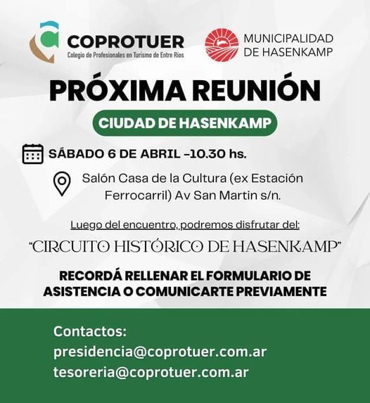 El sábado 6 de abril a las 10:30 en la Casa de la Cultura se llevará a cabo la Asamblea del Colegio de Profesionales en Turismo de Entre Ríos, con la presencia de la Comisión Directiva y profesionales en Turismo matriculados y próximos a acceder a la matrícula.