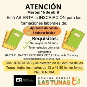 Hasta el martes 23 de abril de 7 a 13, en la sede comunal, está abierta la inscripción para las formaciones laborales de Ayudante de cocina y Soldador Básico. Los requisitos son ser mayor de 18 años y tener estudios primarios completos. Son gratuitas y se dictarán en la Comuna, en forma presencial, todos los martes de 13.00 a 16.30. También pueden anotarse los interesados a través del celular 3434657423.