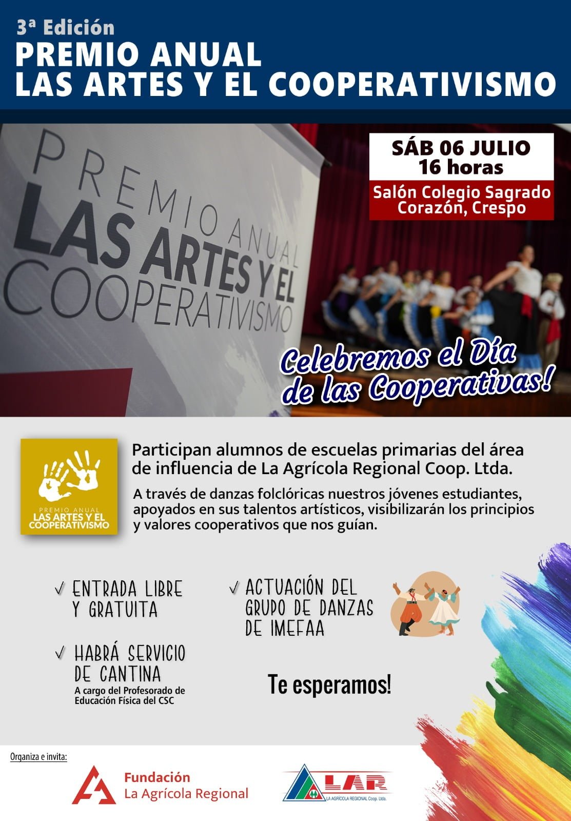 El sábado 6 de julio a partir de las 16.00, en el Salón del Colegio Sagrado Corazón y en el marco del Día del Cooperativismo, entregarán el Premio Anual Las Artes y el Cooperativismo, participando escuelas primarias de localidades donde hay sucursales de LAR y su ejido.