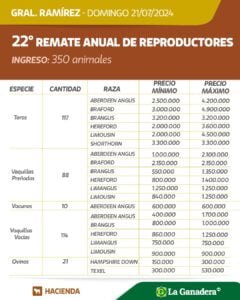 La realización del 22º Remate Anual de Reproductores de la cooperativa La Ganadera, realizado el último domingo en las instalaciones de General Ramírez dejó muy conformes tanto a los organizadores como a los cabañeros y compradores ante los buenos precios y la calidad de la hacienda subastada.