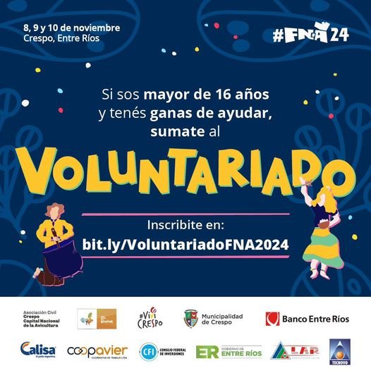 Como en la edición anterior en Crespo buscan que los jóvenes y adultos se sumen como voluntarios a la ‘31º Fiesta Nacional de la Avicultura’, a desarrollarse el viernes 8, sábado 9 y domingo 10 de noviembre, bajo la organización de la Asociación Civil Crespo Capital Nacional de la Avicultura y la Municipalidad de Crespo.