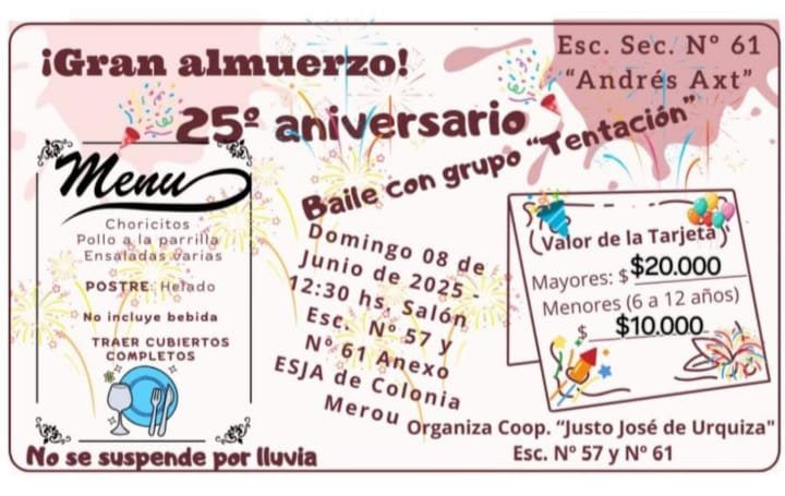 El domingo 8 de junio a las 12.30 en el Salón de la Escuela N° 57 y N° 61 Anexo ESJA de Colonia Merou se llevará a cabo un almuerzo por el 25° Aniversario de la Escuela Secundaria N° 61 ‘Andrés Axt’.