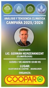El jueves 7 de agosto a las 19:00 se realizará una charla titulada “Análisis y tendencia climática – Campaña 2025/2026” en el Auditorio de COOPAR, ubicado en Aranguren.