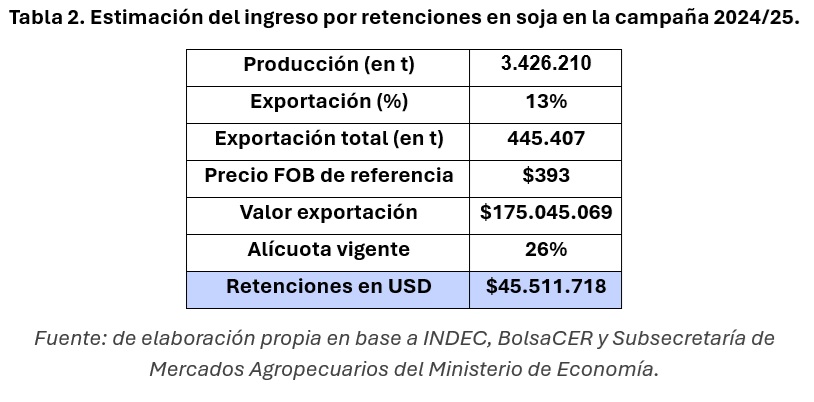 Según la estimación, las retenciones sobre los cultivos entrerrianos representan una transferencia significativa de recursos desde el sector agrícola provincial hacia el Estado Nacional. En la última campaña, ese monto equivalió al valor productivo de 209.240 hectáreas de soja, es decir, el 16% del área sembrada en Entre Ríos, o bien 532.086 toneladas de maíz al precio pizarra del día 4 de septiembre, lo que representa, el 27% de la producción de la última campaña.