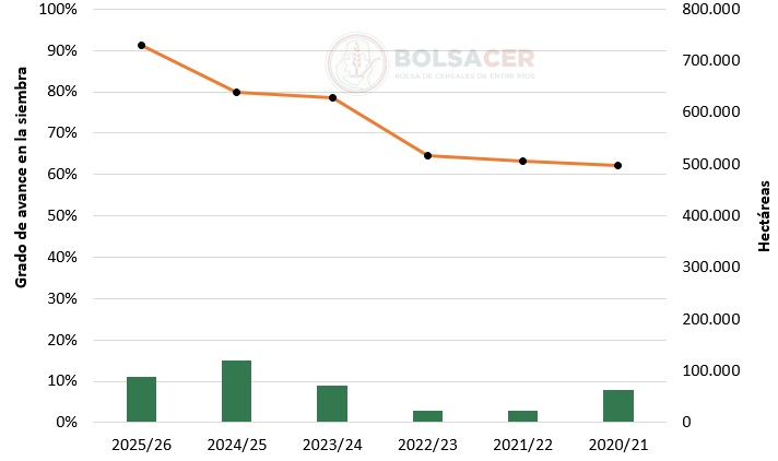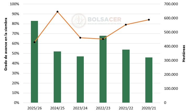 De acuerdo con el Sistema de Información de la BolsaCER, se trataría de la mayor superficie destinada a la siembra de segunda fecha. Si las condiciones climáticas no resultan favorables, es lógico suponer implantaciones en fechas más tardías que las habituales.