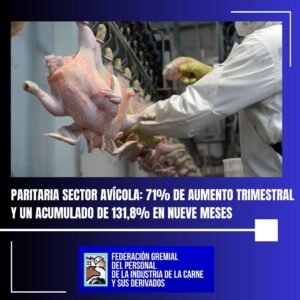 Y destacó que “En relación a la paritaria avícola, se logró un aumento trimestral del 27% en noviembre, 21% en diciembre y 23% en enero 2024 para la paritaria interanual de mayo 2023 – abril 2024 del sector avícola. De esta manera, el acuerdo paritario suma un 71% en tres meses. La Federación lleva acumulado hasta octubre un 60,8% y con esta nueva recomposición salarial alcanza un 131,8% de aumento en un período de nueve meses que abarca desde mayo de 2023 a enero 2024”, dijo.