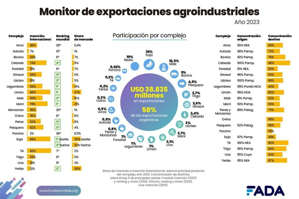 “¿A cuántos países llegamos?”, es uno de los tantos interrogantes que se resuelven con este reporte. “Las cadenas agroindustriales argentinas llevan sus productos a más de 155 países, eso equivale al 80% del mundo. Como principales compradores se destacan Brasil, China, Estados Unidos y Vietnam”, revela David Miazzo, Economista Jefe de FADA. Perspectivas 2024: ¿Qué podemos esperar? Según el informe, las perspectivas de las exportaciones para 2024 son: neutras en términos de demanda internacional; positivas en competitividad cambiaria; positivas en oferta exportable; y negativas en precios. “Podemos esperar un 2024 con mayor nivel de exportaciones respecto a 2023, generado por la tracción de los granos, aunque con menor valor que 2023 a causa de los precios. Con estas perspectivas, se podrían estimar exportaciones de las cadenas agroindustriales alcancen un valor entre USD 50.000 y USD 55.000 millones en 2024, unos USD 15.000 millones por encima del nivel de 2023”, analiza Miazzo. Radiografía de las exportaciones 2023 “No fue un buen año para las exportaciones agroindustriales: de los 20 complejos que analizamos, en 16 cayeron las exportaciones, lo que ocasionó que ingresen 20.680 millones de dólares menos al comparar con lo exportado en 2022. Esto fue producto de la sequía y de los precios internacionales”, observa Pisani Claro. Se destaca que Argentina es primera exportadora mundial de porotos, aceite y jugo de limón, maní y aceite de soja. Estamos segundos en harina de soja y yerba mate y terceros en leche en polvo, maíz y porotos de soja.El estudio de FADA también analiza quiénes son nuestros principales compradores: Brasil (lácteos, legumbres, peras y manzanas y trigo), China (carne aviar y de vaca y cebada), India (girasol y soja), EE.UU. (té, uva, limón y forestal), Vietnam (maíz), Chile (arroz), Países Bajos (maní), Siria (yerba), España (pescado), Costa de Marfil (cerdo) y Alemania (lanas). Una actividad federal con impuestos no tan federales En 2023, Argentina exportó por USD 66.788 millones de dólares. Las cadenas agroindustriales generaron un total de USD 38.835 millones en concepto de exportaciones. Del total de las exportaciones argentinas, 6 de cada 10 dólares provienen de las cadenas agro, lo que equivale al 58% de las exportaciones argentinas. “Los productos agroindustriales salen desde todo el país, es una actividad totalmente federal. Cada rincón de la Argentina tiene miles de trabajadores que se especializan en las producciones de esa región. Por ejemplo, en la Patagonia lo que más se exporta son los rubros pesqueros, peras y manzanas. En la región pampeana son mayoría soja, maní, girasol, maíz, trigo, cebada, carne de vaca, lácteos y carne aviar. En cuyo prevalece la cadena vitivinícola. Desde el NEA es el té, la yerba y productos del complejo forestal. Por último, en el NOA se especializan en limón, porotos y garbanzos”, afirma la economista. “Sin embargo, ese federalismo no se refleja desde lo impositivo, ya que el 89% de lo recaudado por AFIP en Derechos de Exportaciones viene de las cadenas agroindustriales, y ese impuesto no es coparticipable a las provincias. O sea, es trabajo y recursos que se generan a lo largo y ancho del país y que quedan en el Estado nacional”, concluye Miazzo.
