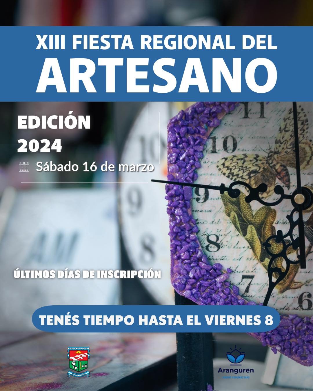 El Municipio confirmó que el sábado 16 de marzo a partir de las 18.00 en el Circuito del Reloj se llevará a cabo la XIII Fiesta Regional del Artesano 2024.